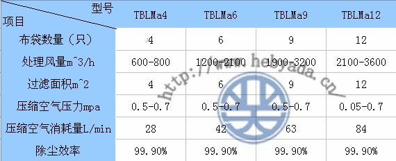 TBLMa系列脈沖式除塵器主要技術(shù)參數(shù)及性能指標(biāo)參數(shù)表